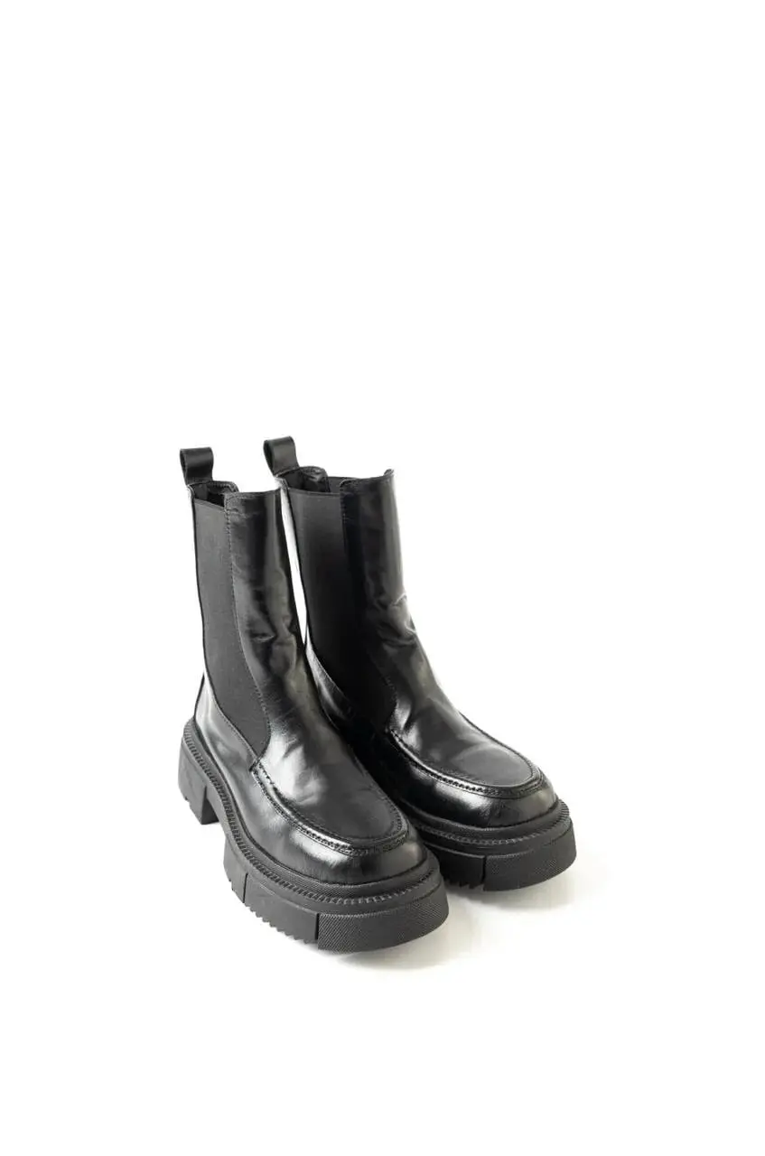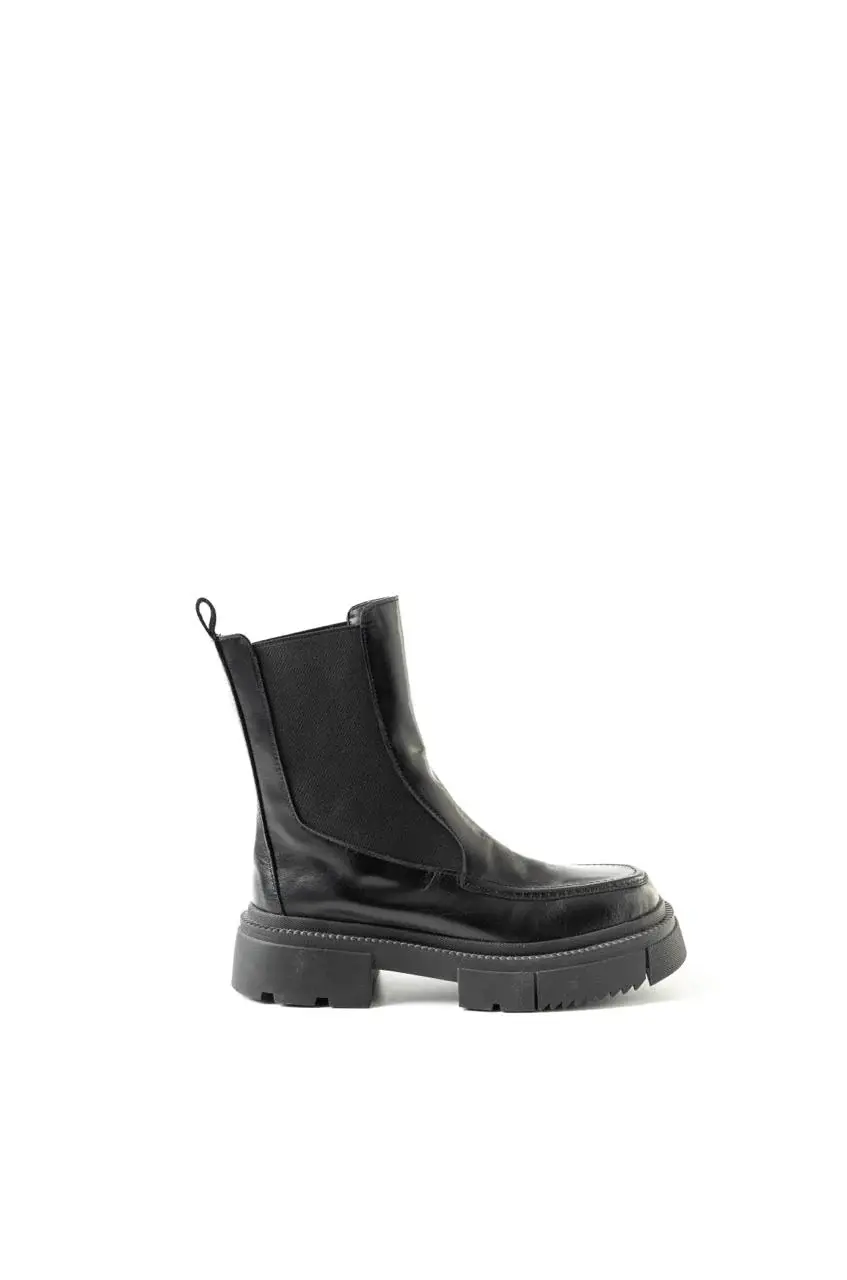 Botines negros estilo chelsea con un giro moderno: caña media, elástico lateral para un calce fácil y suela chunky dentada que aporta altura y comodidad