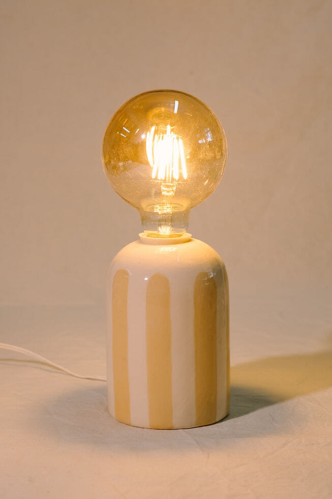 Luminaria de cerámica artesanal con base cilíndrica. Su diseño minimalista se combina con la calidez de la bombilla expuesta, creando una pieza perfecta tanto para iluminar como para decorar.
