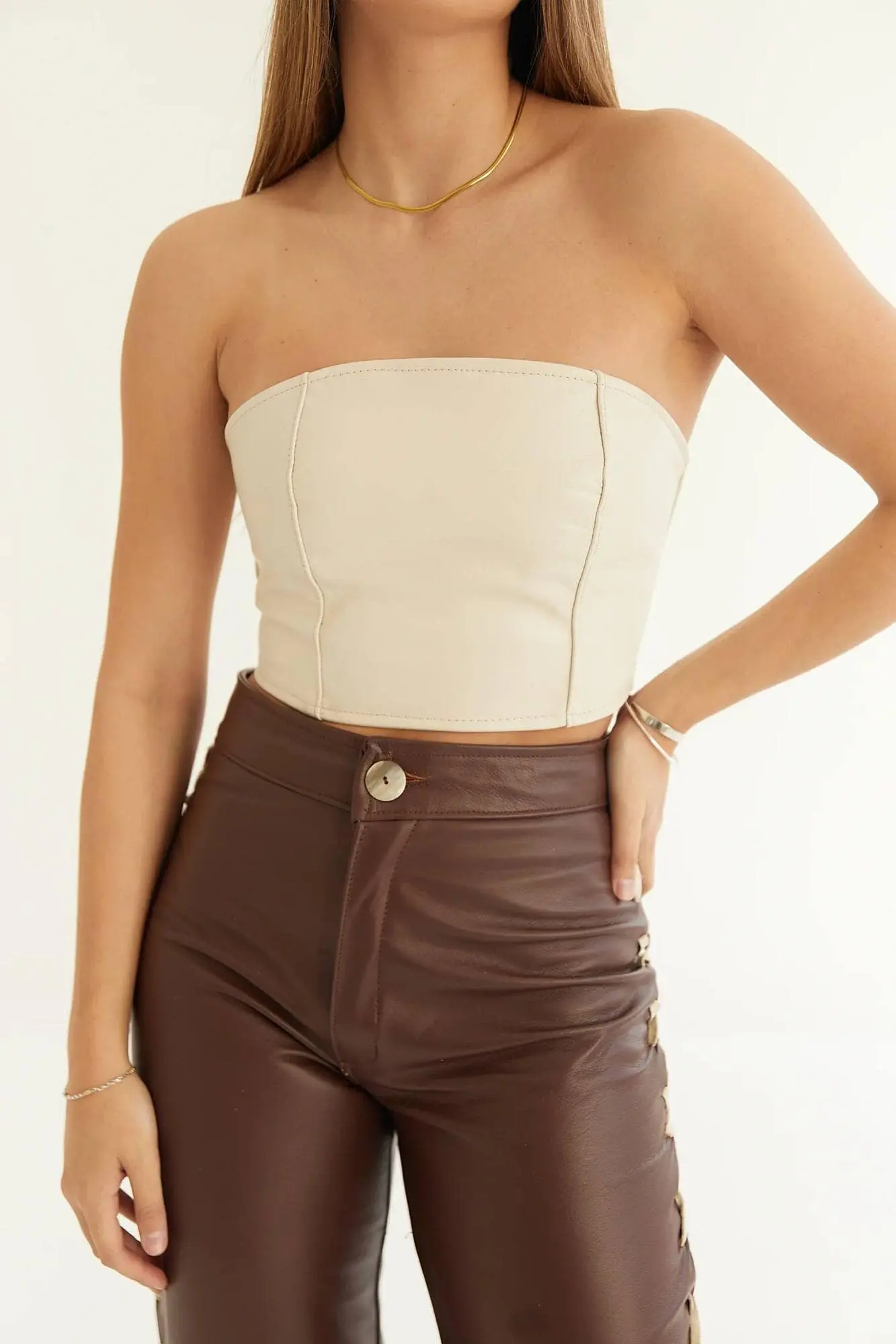 Pantalón de 100% cuero en tono marrón chocolate, de tiro alto y corte recto con leve flare. Su diseño combina estructura y sensualidad con detalles artesanales: costuras marcadas, aberturas en el ruedo y trenzado lateral que aporta un toque distintivo y audaz.