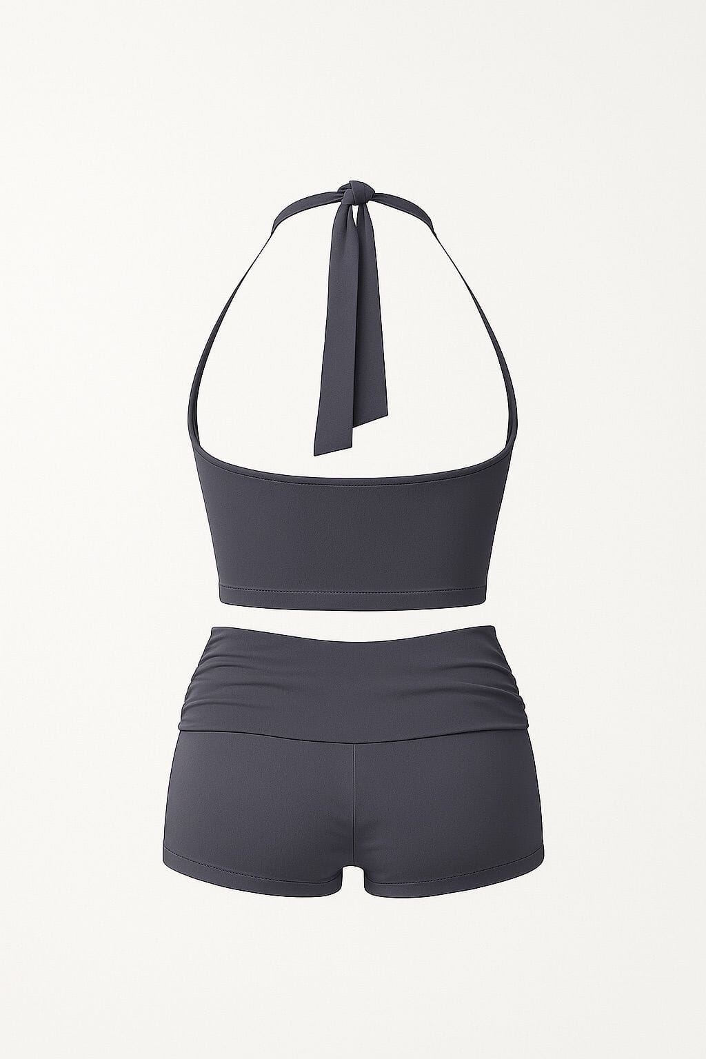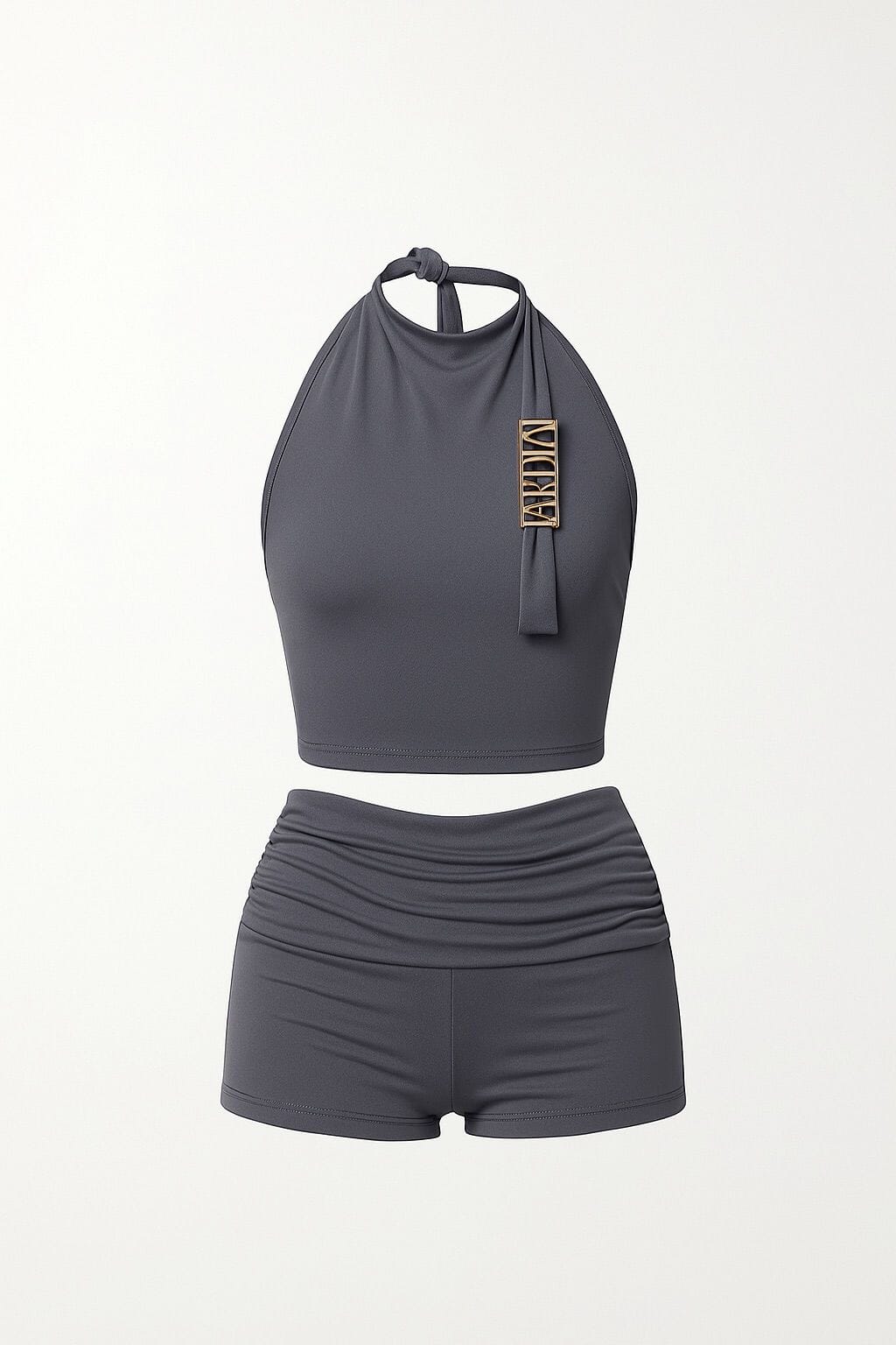 Top estilo halter confeccionado en tejido elástico de acabado mate, ideal para lograr un look moderno y sofisticado. Presenta cuello alto con lazo que se anuda en la nuca y detalle de aplique metálico dorado con logo, que aporta un toque distintivo y elegante.